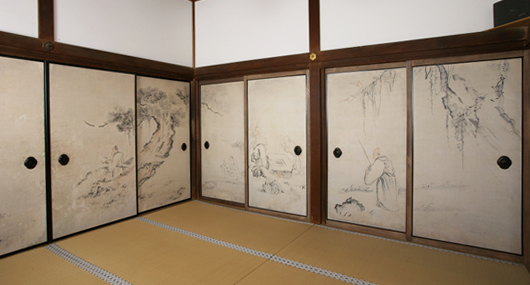 ◆西の間与謝蕪村:紙本墨画淡彩「棕櫚に叭叭鳥図」襖 12面◆室中の間与謝蕪村:紙本墨画淡彩「飲中八仙図」襖 12面◆東の間池大雅:紙本墨画淡彩「琴棋書画図」襖 12面◆上官の間与謝蕪村:紙本墨画淡彩「山水人物図」襖 4面、壁画 12面