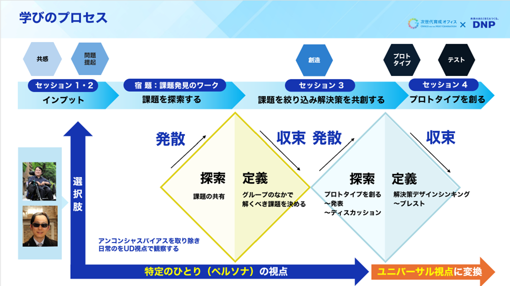 デザイン思考のステップを活用し、はじめに社会課題を自分ごと化するためのインプットを受けます。得た視点を使って社会を見渡して課題を見つけ、解決策を考えます。
