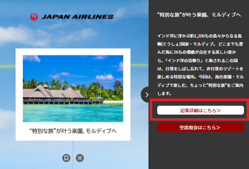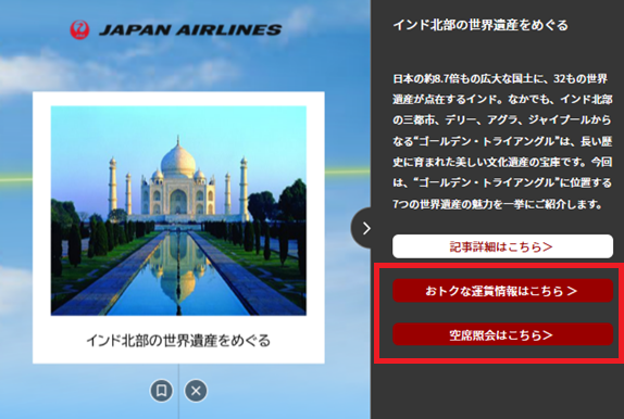 各記事の解説欄には運賃情報や空席状況を確認できるリンクを設定しています。キューブの中で記事探索するだけでなく、気になった記事から空席照会までの動線を設定することで、ユーザーの興味・関心の意欲を損なうことなく購買フェーズまで繋げます。
