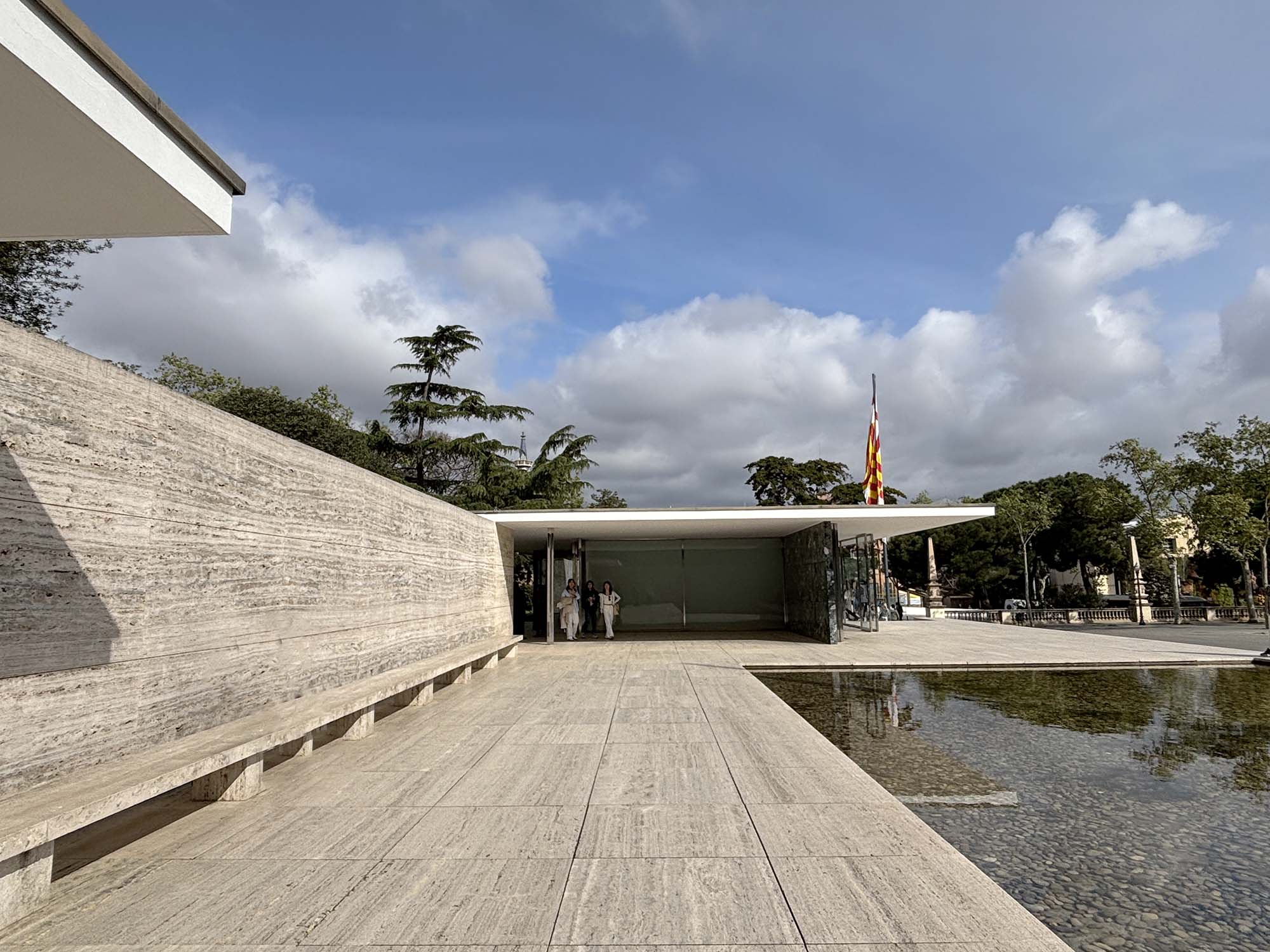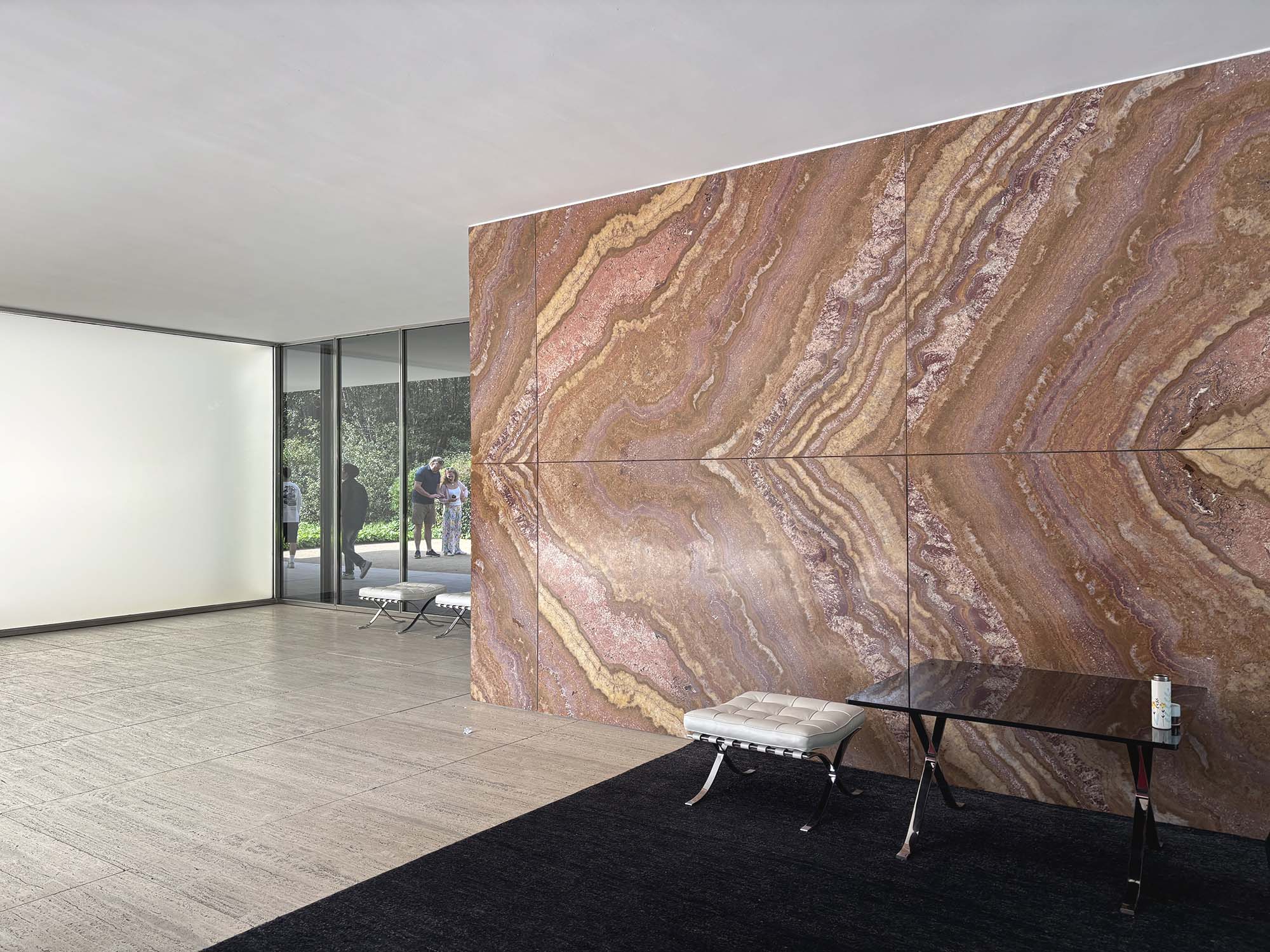 近代建築の巨匠の一人、ミース・ファン・デル・ローエが設計した建物を見るために、バルセロナ・パビリオンを訪れました。この建物は、1929年のバルセロナ万国博覧会におけるドイツ館として建設され、1930年に一度解体されたものの、1986年に同じ場所で「ミース記念館」として忠実に復元されました。水面に建物が浮かんでいるかのように見えるこの建築は、ミースが得意としたグリッドシステムに基づき、ガラスとスチールを用いたシンプルな構成で成り立っています。その中でも、壁面を彩る大理石のダイナミックな表情がひときわ際立っています。使用されている大理石には、トラバーチン、緑色のヴェルデ・アルピ、そしてゴールデン・オニックスなどがあり、特に室内の壁にブックマッチ(左右対称の模様)で仕上げられた石材は、圧倒的な存在感を放っています。