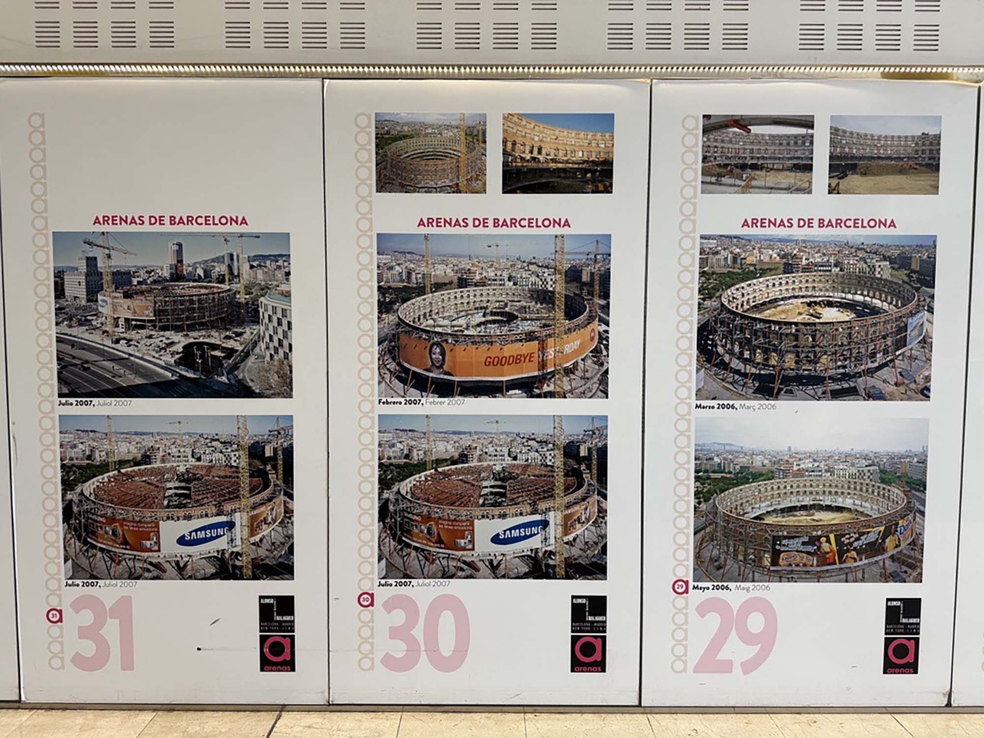 施設内部には工事の様子を定点で観測した資料が展示されており、写真からも改修工事の難しさが伝わってきます。資料によると着工は2004年。2011年の完成まで一枚ずつ今のラス・アレナスの姿に近づいてくる写真を見ていくことで、当時の街の様子やこの建物に込められた人々の想いを感じることができます。また闘牛場として使われていた時代の資料も展示してあるので、読めばより深くバルセロナの歴史を楽しめるようになっていました。