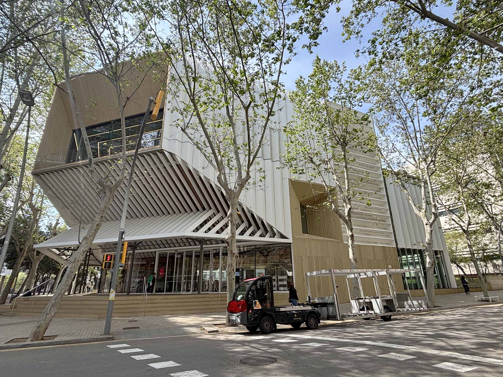 そしてその向かいにある建物は、スイスの建築家ユニットHerzog & de Meuronによって設計された自然科学博物館(Museum of Natural Sciences of Barcelona)です。写真ではダークグレー色に見えますが、やや青みの色で、鉱物の塊が宙に浮いたような佇まいです。