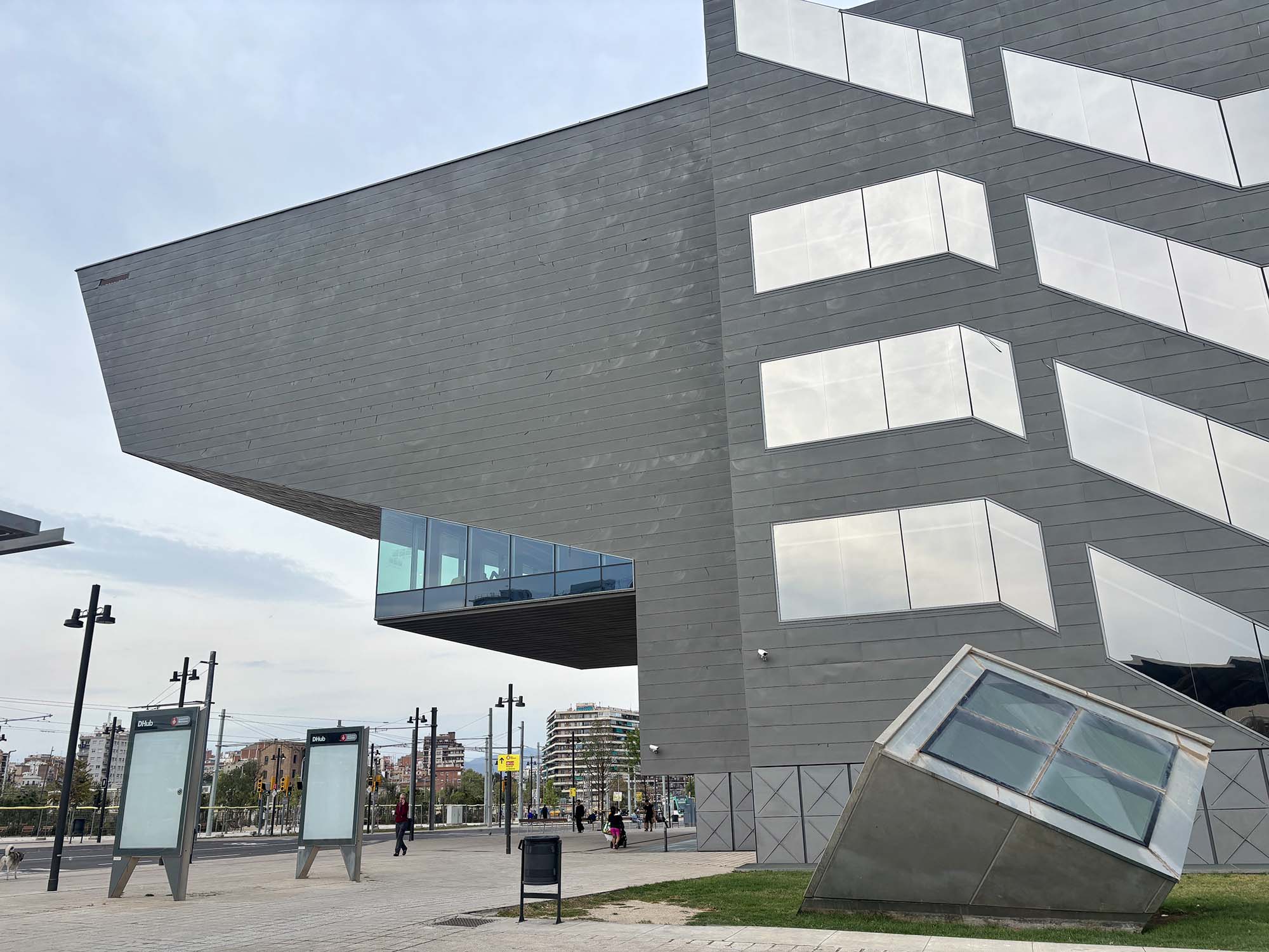 先ほど紹介したグロリエス広場のすぐに近くにあるDHUB. Barcelona Design Centerはスペインのアートやデザインにふれられるデザインセンターです。フラットな平屋の上に、個性的な形状の建物が乗っかったような個性的な形状をしています。スペインの設計事務所MBM Arquitectesによる設計です。