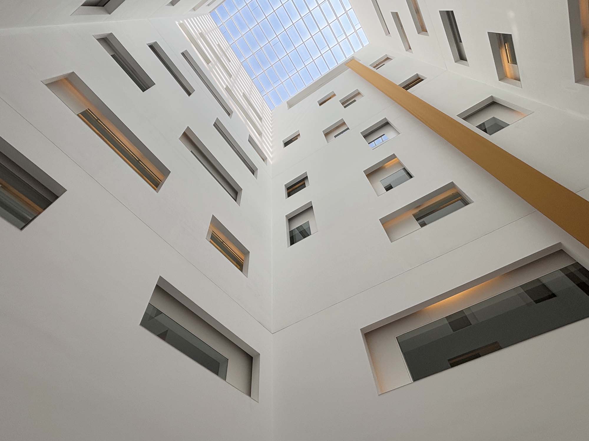 高級なブランドショップが立ち並ぶグラシア通りに面しているMandarin Oriental Barcelonaはもともと銀行だった建物をホテルに生まれ変わらせ、パトリシア・ウルキオラのデザインで2009年に開業しました。石造りのエントランスを通ると、ロビーまでのアプローチにあたるスロープがあります。吹き抜けの空間は、ところどころ四角形を切り抜いたような開口部があり、空間にリズムを生みだしています。