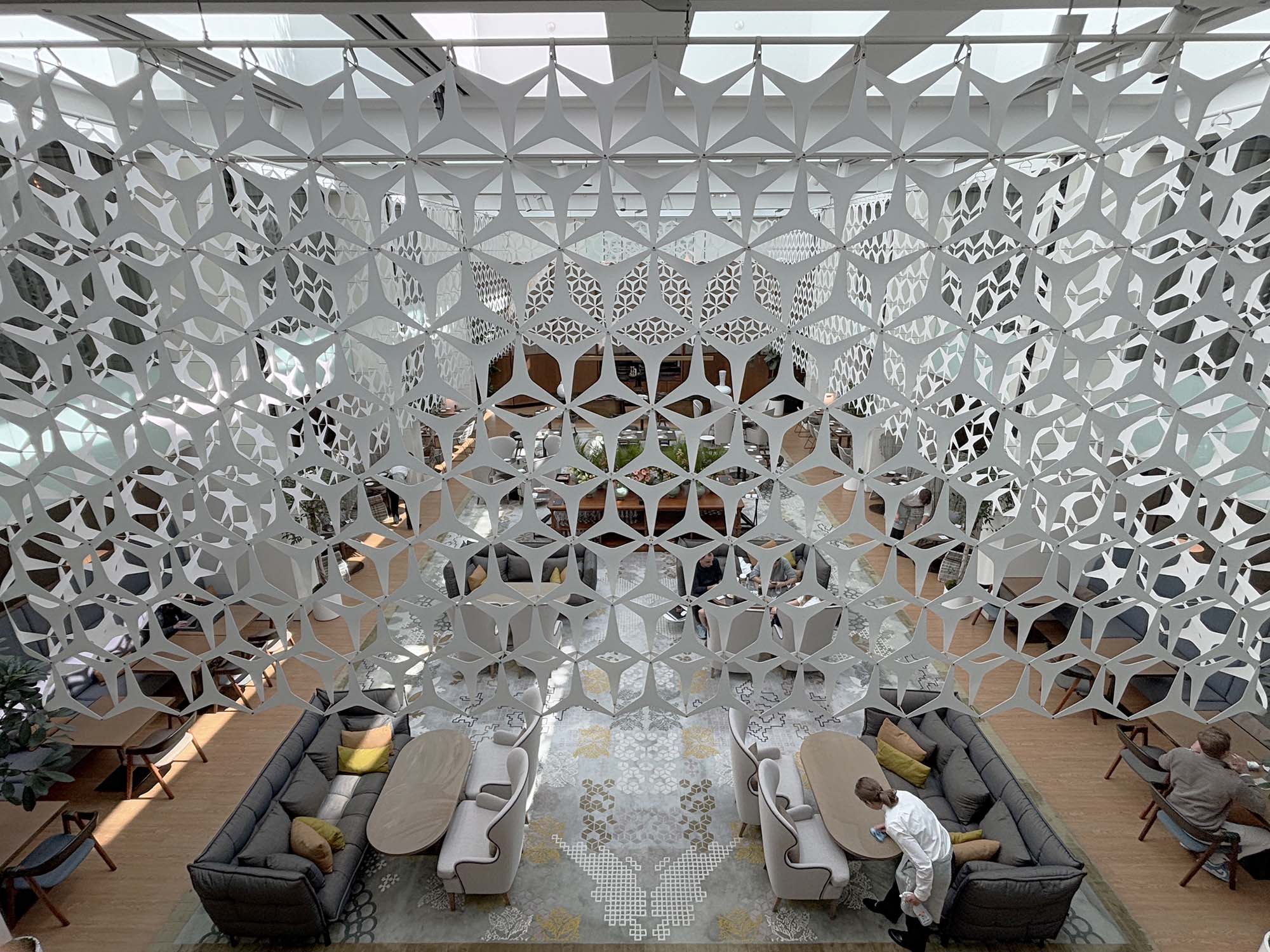 ロビーフロアからは、下の階にあるレストランを見下ろすことができます。壁面や天井から吊り下げられる形で、幾何学模様に切り抜かれたメタル製の装飾が空間を彩り、視線をゆるやかに制御しています。視線をさえぎりながらも空間のつながりを保つというデザイン意図があるそうです。ラグにはブランドイメージであるオリエンタルな雰囲気を感じさせるアジアンテイストの花が描かれています。また、ロビーの天井にはミラーが施されており、その反射によって空間が上下に広がって見え、実際よりも天井が高く感じられました。