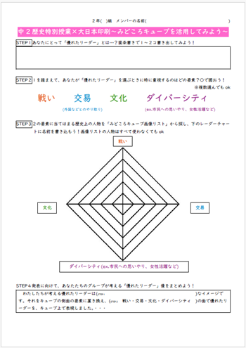 優れたリーダーについて検討するためのワークシートを作成し、「みどころキューブ」を扱う前の導入段階で記入をさせた。