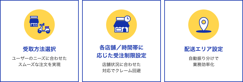 店舗の商圏に応じた配送エリア設定が可能です。店舗ごとに配送エリアを設定することで住所に合わせてご利用店舗を自動振り分けいたします。