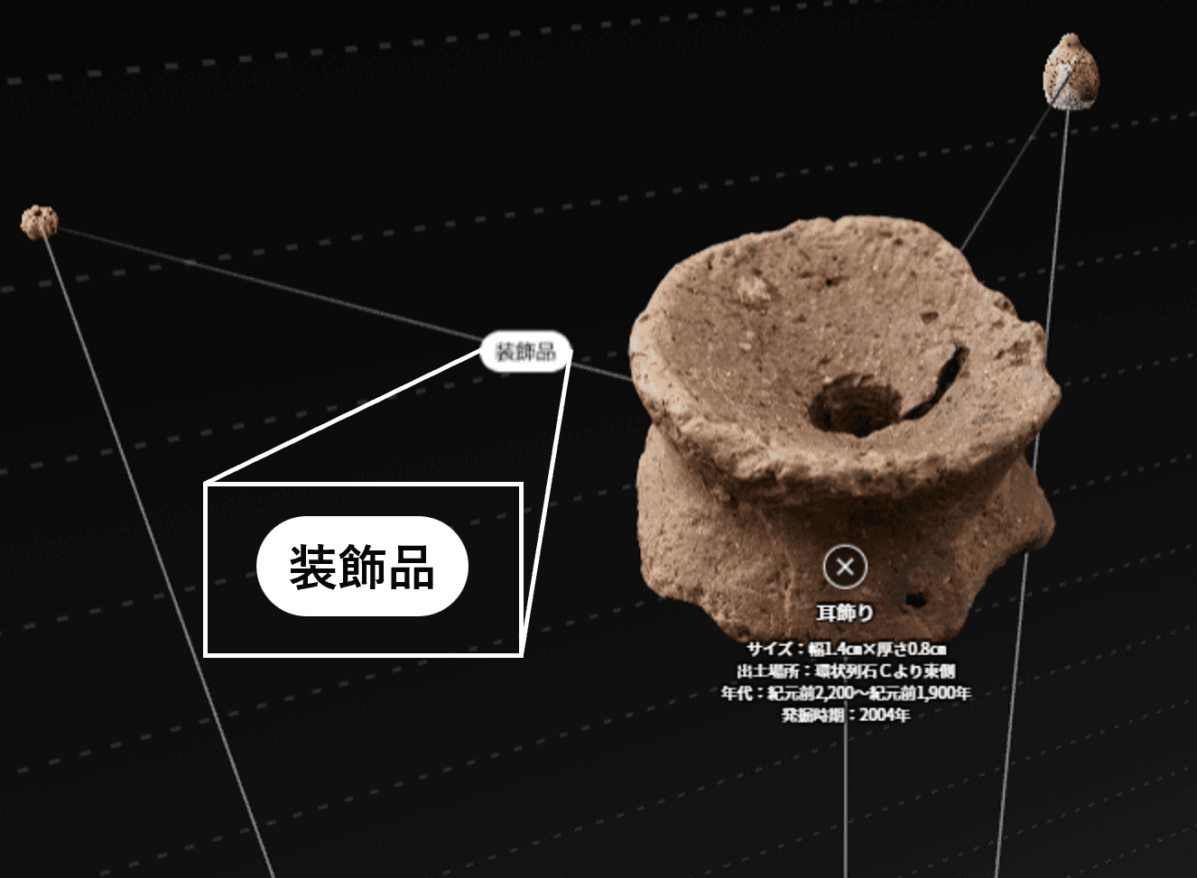 みどころキューブでは、遺跡からの出土品を「発見された場所」と「出土地点の深さ」を軸に25点展示。それぞれの関係性や歴史、共通点などを調べることができます。縄文館に設置された55インチのタッチパネルディスプレイのほか、伊勢堂岱遺跡のホームページにて公開中です。