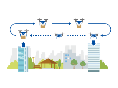 従来人の手やクルマで運んでいた荷物を、ドローンで空中輸送します。山中や離島、過疎地域など、従来の輸送方法では困難な地域に新しい物流手段を提供する一方、災害時などの支援物資の輸送にも貢献します。