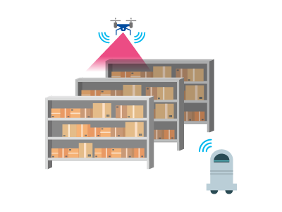 倉庫の荷物にRFIDタグを貼り、ドローンでタグからの電波を受信することで在庫を確認します。人の手や目の届かない倉庫の奥まで、ドローンの目で管理することができます。