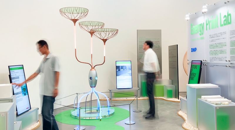 DNPは、2025年9月23日から10月13日まで「2050年 DNPが描く自然エネルギー社会」をテーマに、FLEゾーンで展示・発表を行っています。本展示では、暮らしの中で生み出されたエネルギーを活用し、地球環境に負荷をかけることなくエネルギーを循環する社会の実現に向けたアイデアを紹介。DNPのほか、共創パートナー9者との連携により、未来のエネルギー社会に向けて挑戦する取り組みを紹介しています。展示空間を、産官学の垣根を超えた共創による未来社会の実験場と位置づけて活用し、DNPの技術力・創造力を活かしたエネルギー分野におけるイノベーション創出に向けて対話を行うなど、持続可能な「未来のあたりまえ」を提案し、体験いただいています。