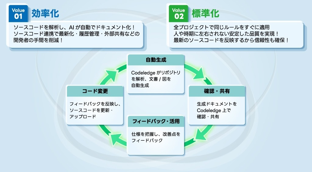 Codeledgeとは、GitHubと連携してソースコードをAI解析し、技術ドキュメントを自動生成・更新するサービス。文章だけでなくフローチャート等の図版も生成でき、編集・更新履歴を一元管理することで、ドキュメント作成の手間を減らし、品質の標準化と開発生産性向上を支援する。 |
